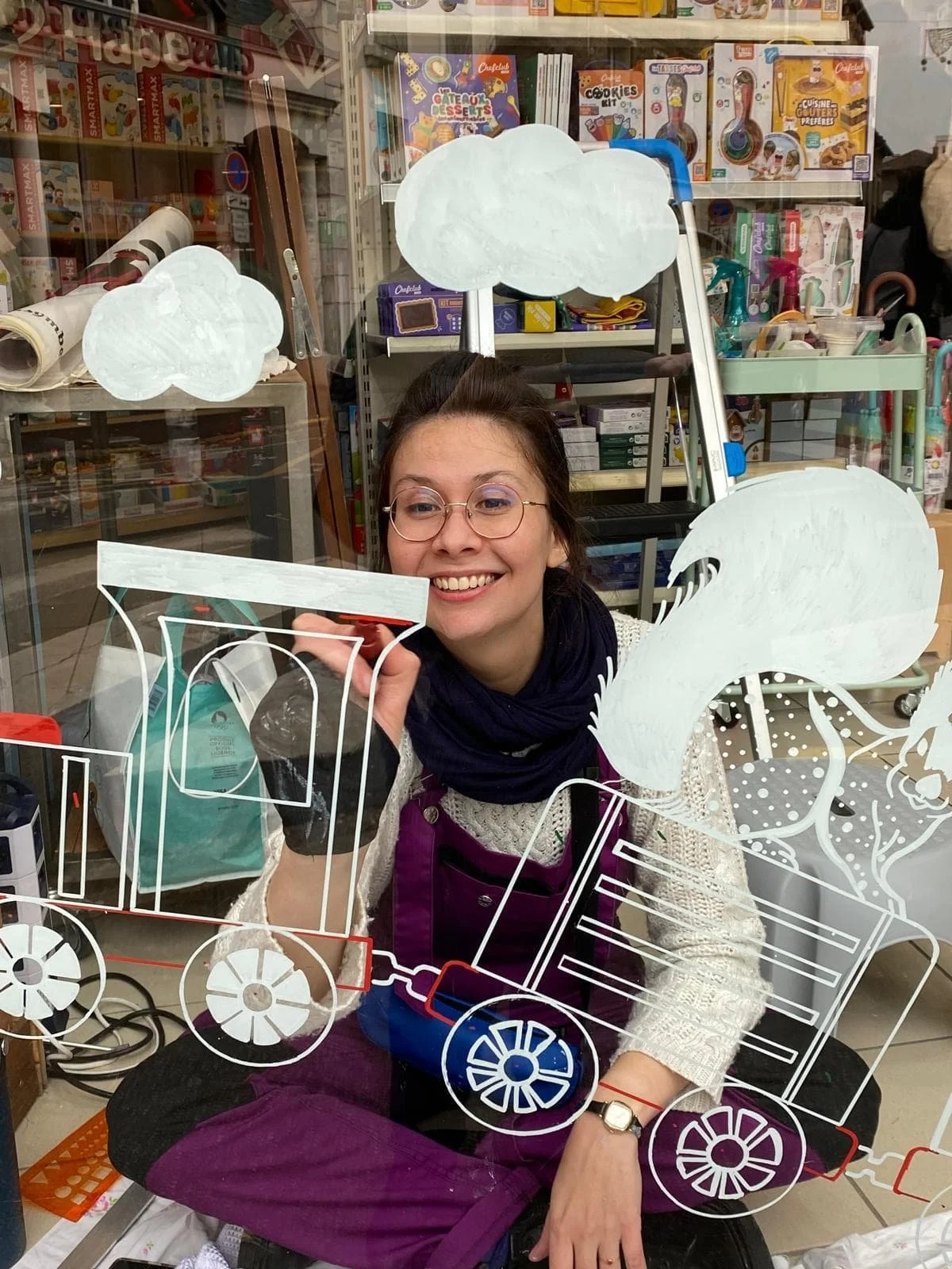 Peinture sur vitrine de Noël, sur-mesure, pour la boutique de jouets Monde Imaginaire à Houilles (78).
