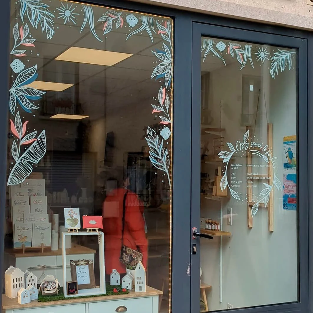 La vitrine comprend également une couronne florale intégrant les horaires d’ouverture et le slogan de la boutique : “Osez semer le bonheur”. Ce design sur-mesure permet à la peinture sur vitrine de communiquer avec élégance ces informations pratiques, tout en renforçant l’identité de marque de Sem & Ose.