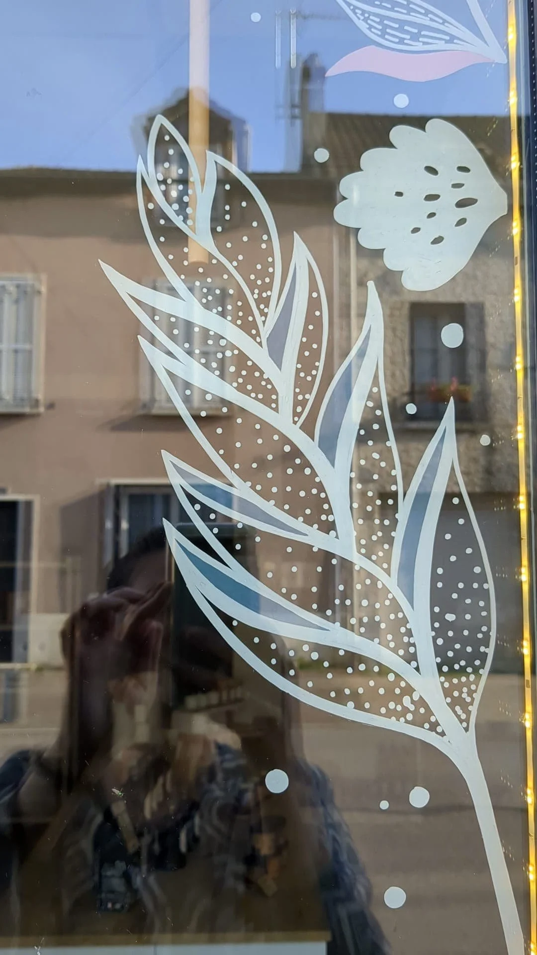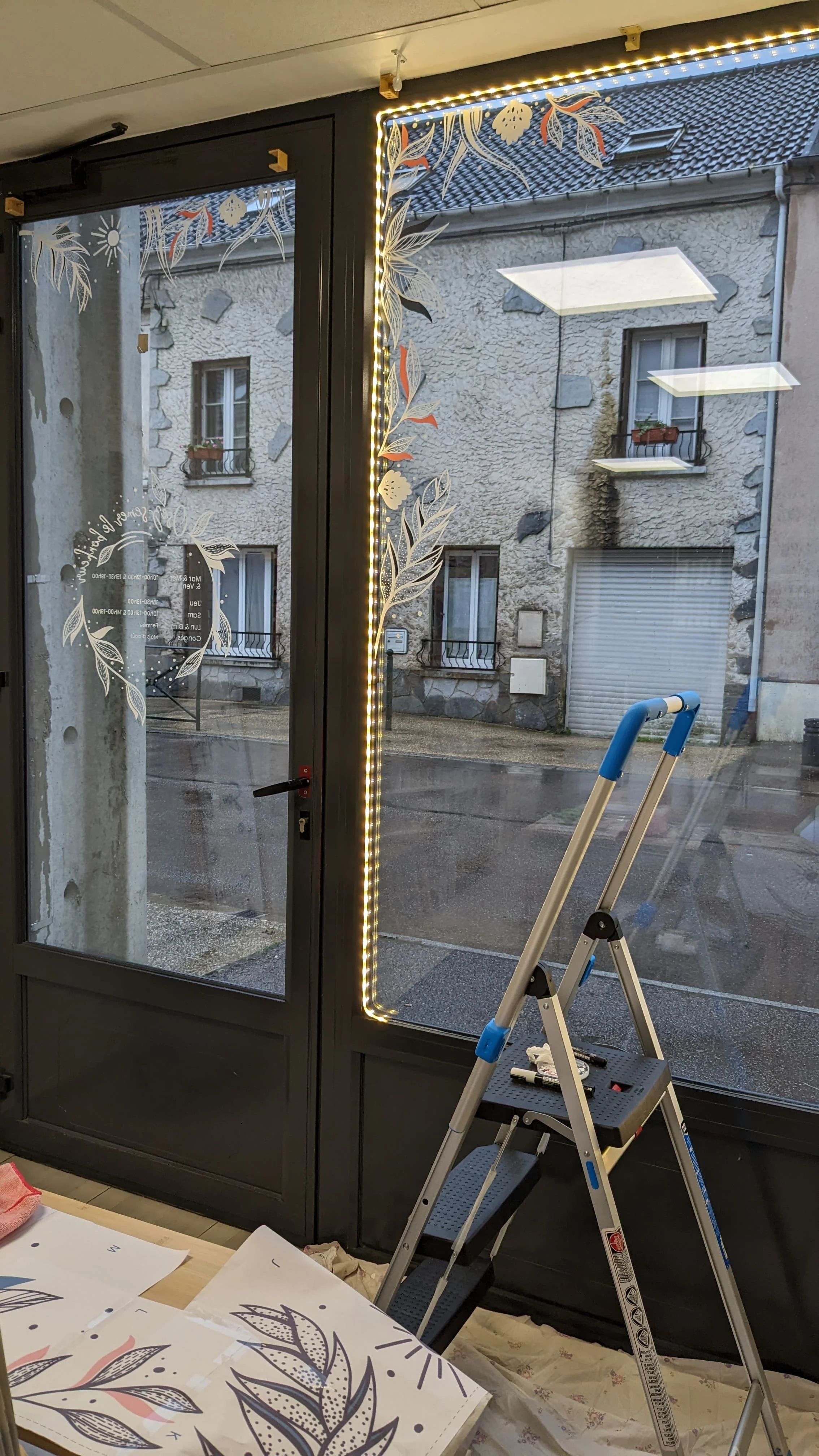 L’installation a été pensée pour s’adapter à la configuration de la boutique : la vitrine est relativement petite et la commerçante présente ses produits sur une étagère contre la vitre. La frise se positionne sur la partie haute, encadrant les produits sans perturber leur agencement habituel.